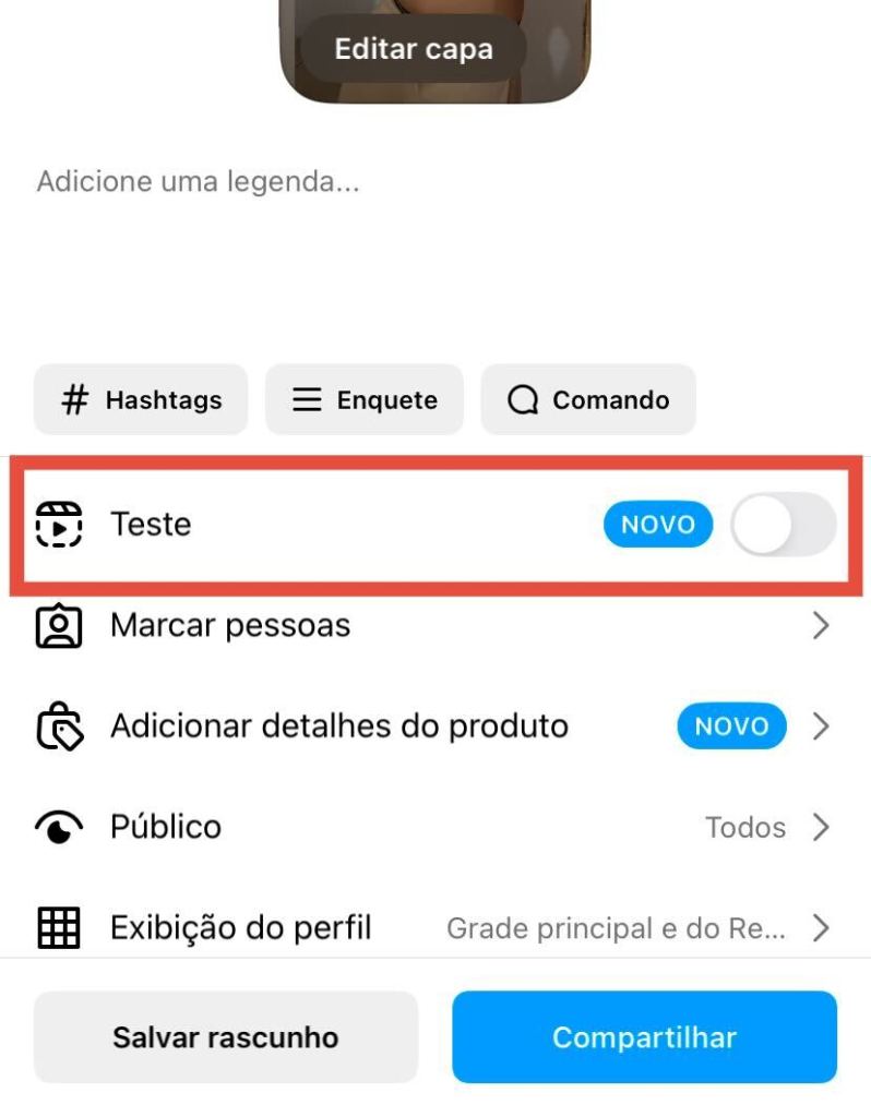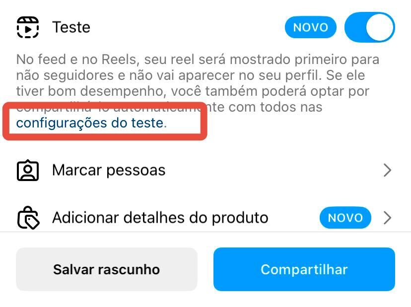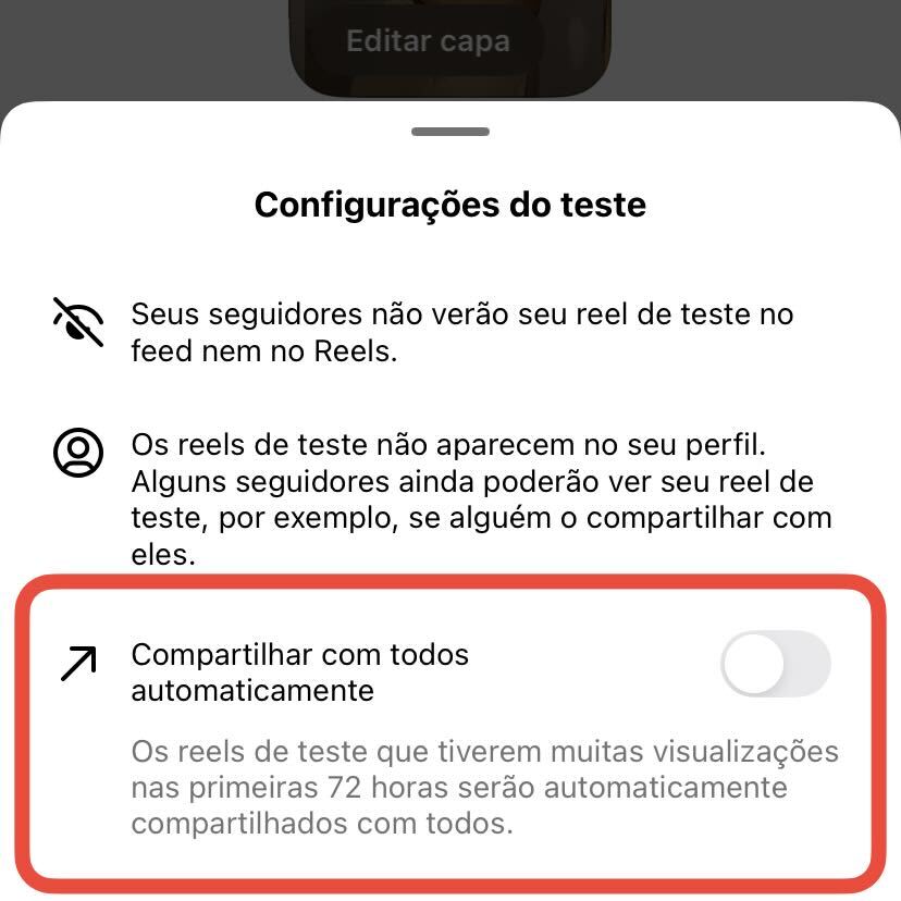 Clicando nela, você pode ativar a opção de compartilhar o Reels de Teste automaticamente com seus seguidores 72h após publicado.
